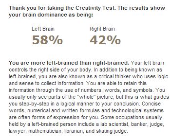 This week I found some 'tests' you can take to see whether you use your right or left brain more, and see how creative you really are!