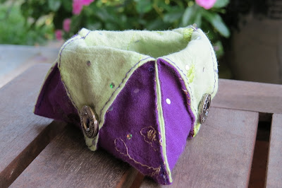It's a great little tutorial, and is basically a kind of fabric origami bag as you just make a double sided triangle using two pieces of fabric, then fold and stitch the edges together before adding the buttons. Nice and easy!