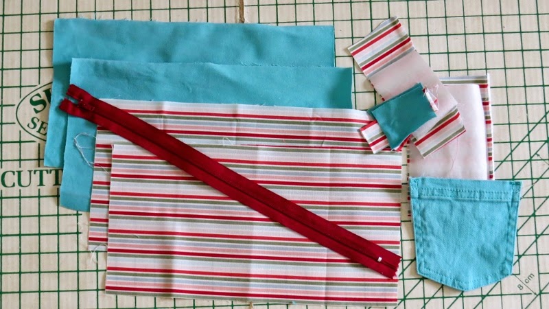 First take your zip and the small rectangles of both fabrics. You will use these for the zip ends.