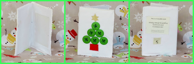 This card was made white denim from a pair of old jeans, fabric scraps and buttons for the tree.