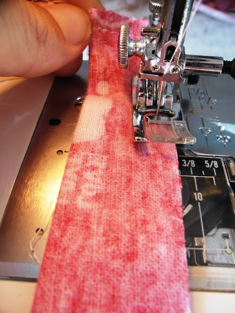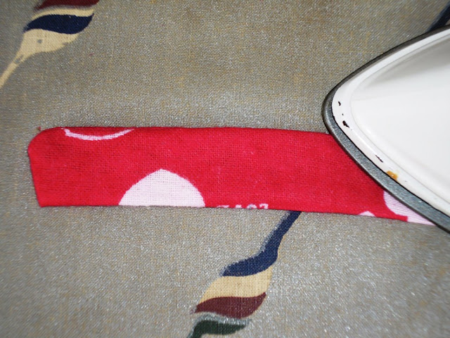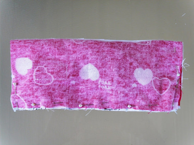 Take rectangular scraps of whichever fabric you like - I chose my inner red fabric. Place 2 pieces right sides together on either side of the zip, pinning where you want the zip to end. Stitch these pieces in place, and trim the very end of the zip off.