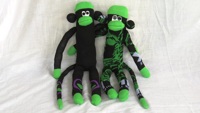 So, I decided to make them into something different and gift them to a couple of kids who I know will appreciate these Incredible Hulk Sock Monkeys!