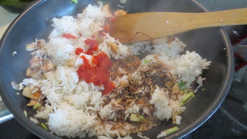 Then add the rice, some kecap manis (like sweet thick soy sauce) and sambal oleak (spicy hot chilli paste).