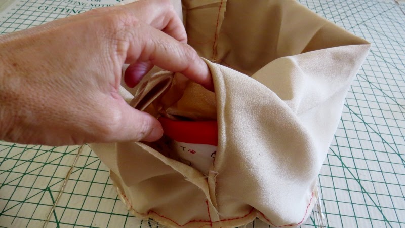 Slip the outer bag inside the inner bag which is inside out. So the right sides of the inner and outer bag are facing each other.