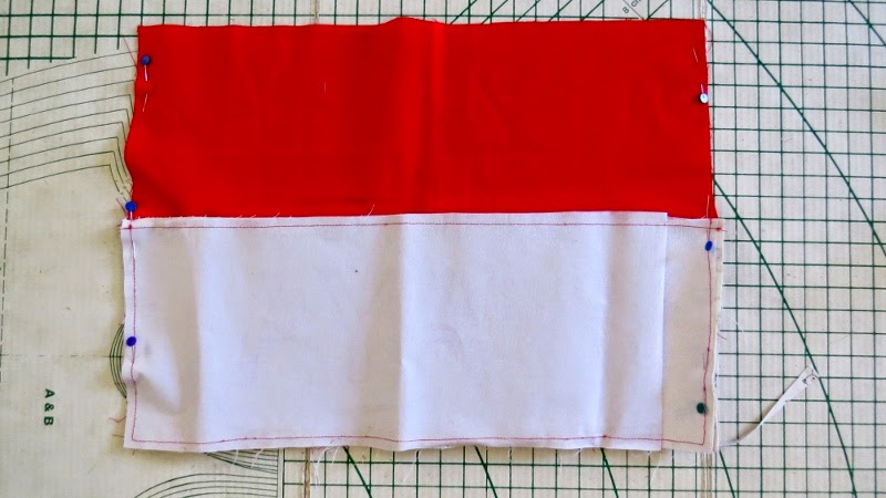 Place the small rectangle on top of the large rectangle at the bottom and lining up the edges. Stitch down both sides to hold in place.