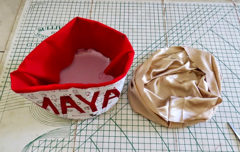 You will need 2 co-ordinating outer fabrics, one inner fabric and some buckram (or stiff interfacing). Extra pretty fabric and fusible webbing for personalised name applique.