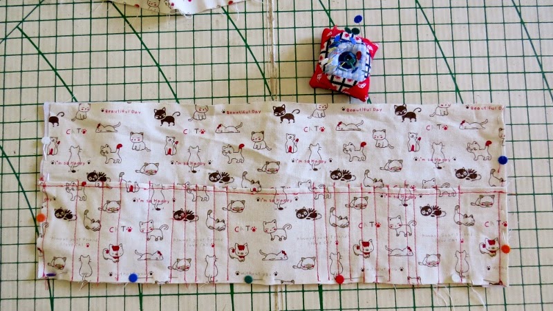 Then take out the hooks and scissors and stitch lines where you have pinned to create the pockets.
