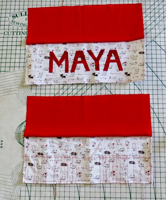 Next take your other outer fabric rectangles and place them face down on these rectangles you just made. Pin then stitch along the top edge of the name piece and the top edge of the pocket piece.